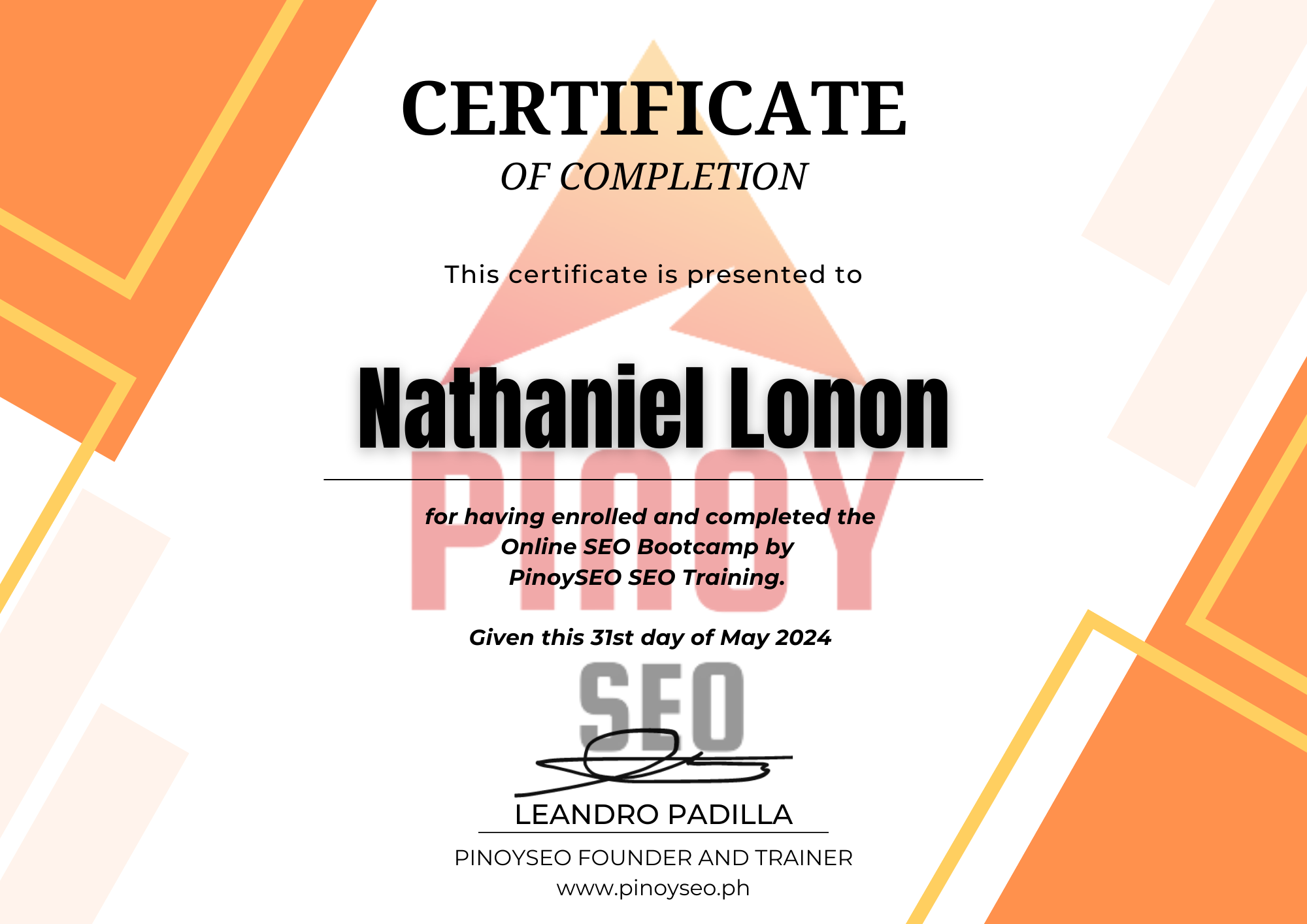 I’m Nathaniel Lonon, an independent WordPress builder since 2024. I began my career as an SEO Specialist, trained by Pinoy SEO,an award-winning freelance SEO specialist, through paid courses in the Philippines.